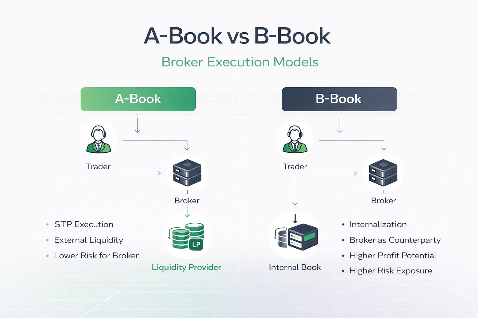 En el entorno del brokerage de Forex minorista e institucional, elegir el modelo de ejecución adecuado afecta directamente a la rentabilidad del broker, su posicionamiento regulatorio y su estabilidad a largo plazo. Ya sea operando como creador de mercado (broker B-Book), como broker Straight Through Processing (STP) o con una estructura híbrida, la decisión define cómo se transfiere, internaliza o cubre el riesgo.